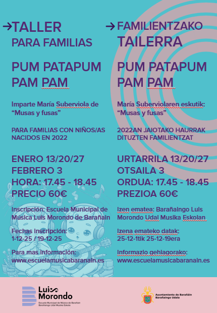 A partir de enero 2026 comenzaremos con el TALLER dirigido a familias con niños y niñas nacidos en 2022 (3 a 4 años). Este taller cuyo nombre es PUM PATAPUM PAM PAM será dirigido por la pedagoga musical María Suberviola (Musas y Fusas).
